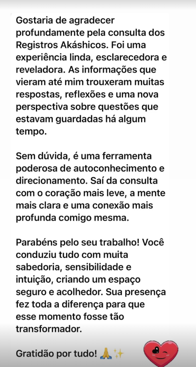 Minhas análises são enviadas por áudio e custam R$ 260,00 no momento. Com a nossa parceria pretendo oferecer consultas on-line ao vivo (do Mapa Essencial) no valor de R$ 487,00 (com apresentação de slides enquanto apresento o mapa e espaço no momento final para tirar dúvidas e esclarecer tópicos). Para o Mapa completo ao vivo, gostaria de conversar com vocês para alinhar o valor.